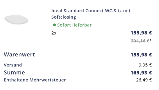 Das exakt gleiche Modell würden wir 2 × bei anderen Shops wesentlich günstiger finden. Zum Beispiel für ca. 108 € hier: https://www.sonono.de/ideal-standard-connect-wc-sitz-mit-absenkautomatik-weiss-a185128.php